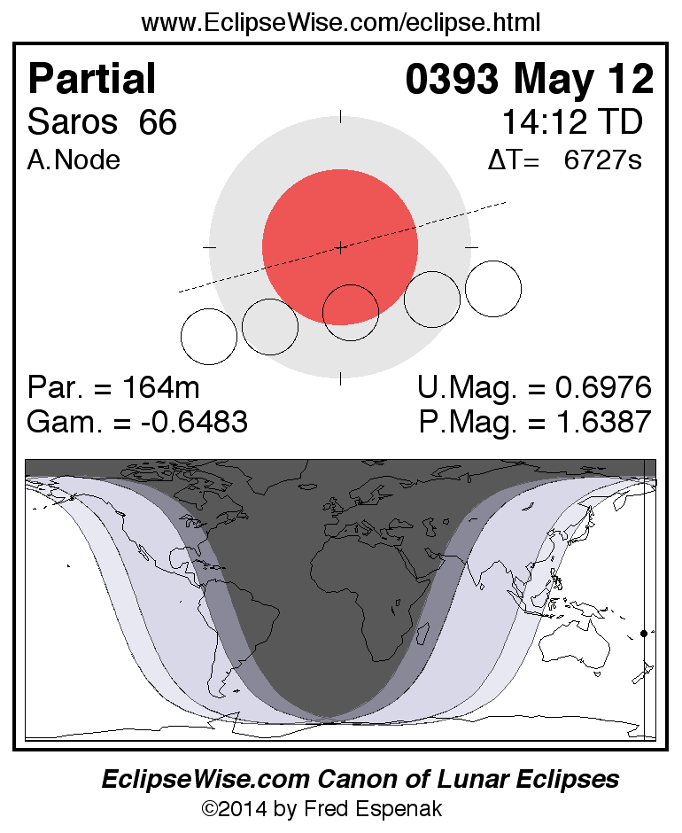 The partial lunar eclipse of 0393 May 12 is followed two weeks later by a annular solar eclipse on 0393 May 27.