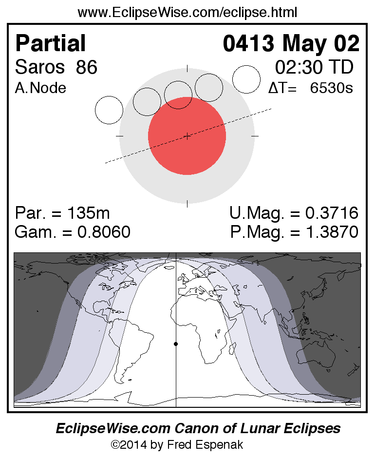 The instant of greatest eclipse takes place on 0413 May 02 at 02:30:05 TD (00:41:16 UT1).