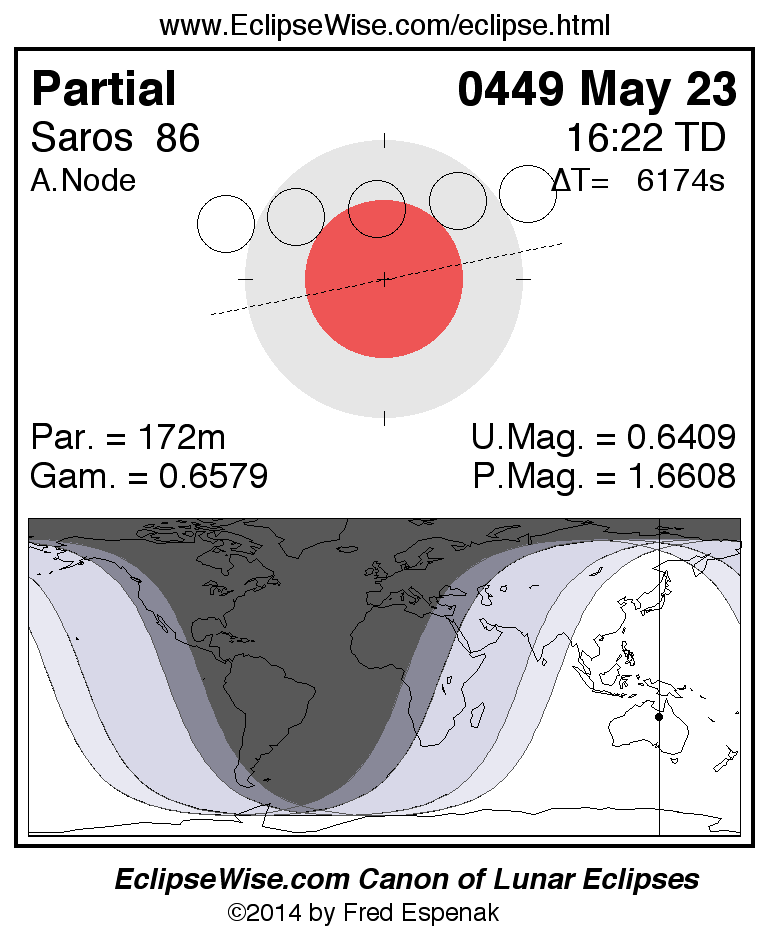 The partial lunar eclipse of 0449 May 23 is preceded two weeks earlier by a total solar eclipse on 0449 May 08.