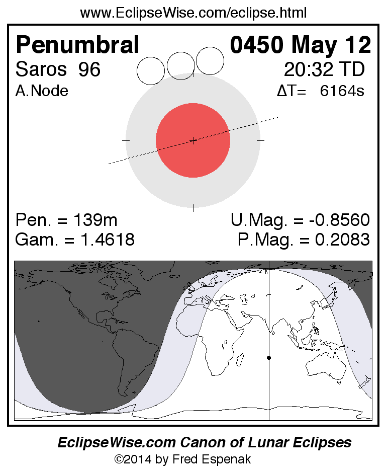 Another lunar eclipse occurs one synodic month before the 0450 May 12 eclipse. It is the penumbral lunar eclipse of 0450 Apr 13.