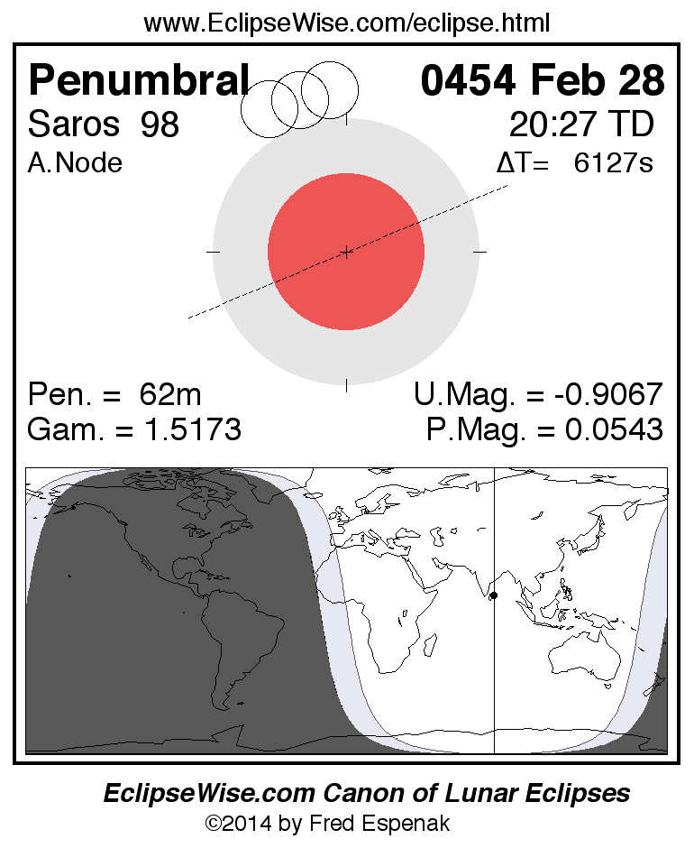 Another lunar eclipse occurs one synodic month before the 0454 Feb 28 eclipse. It is the penumbral lunar eclipse of 0454 Jan 30.
