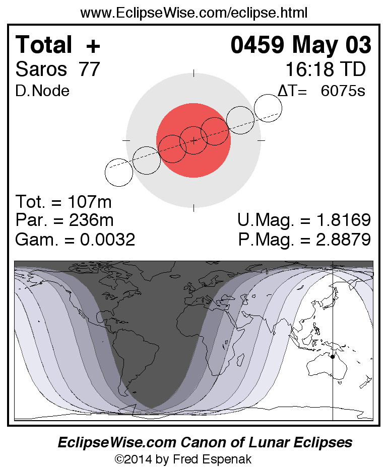The total lunar eclipse of 0459 May 03 is preceded two weeks earlier by a partial solar eclipse on 0459 Apr 18,