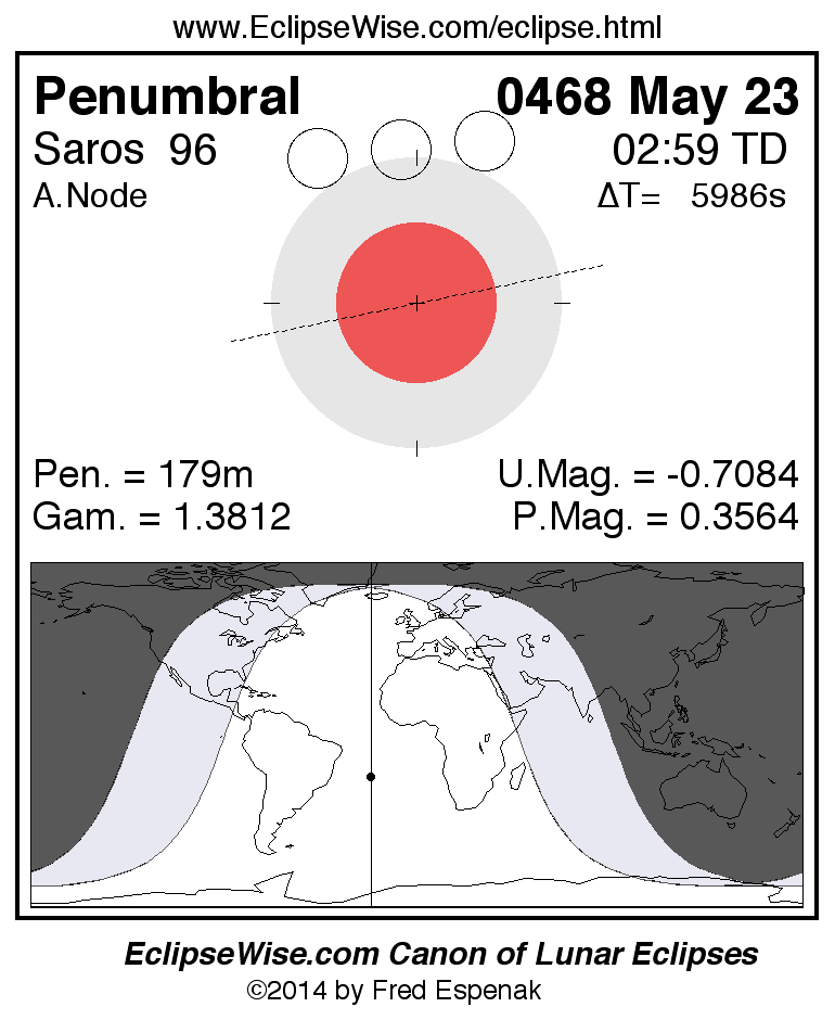 The penumbral lunar eclipse of 0468 May 23 is preceded two weeks earlier by a total solar eclipse on 0468 May 08.