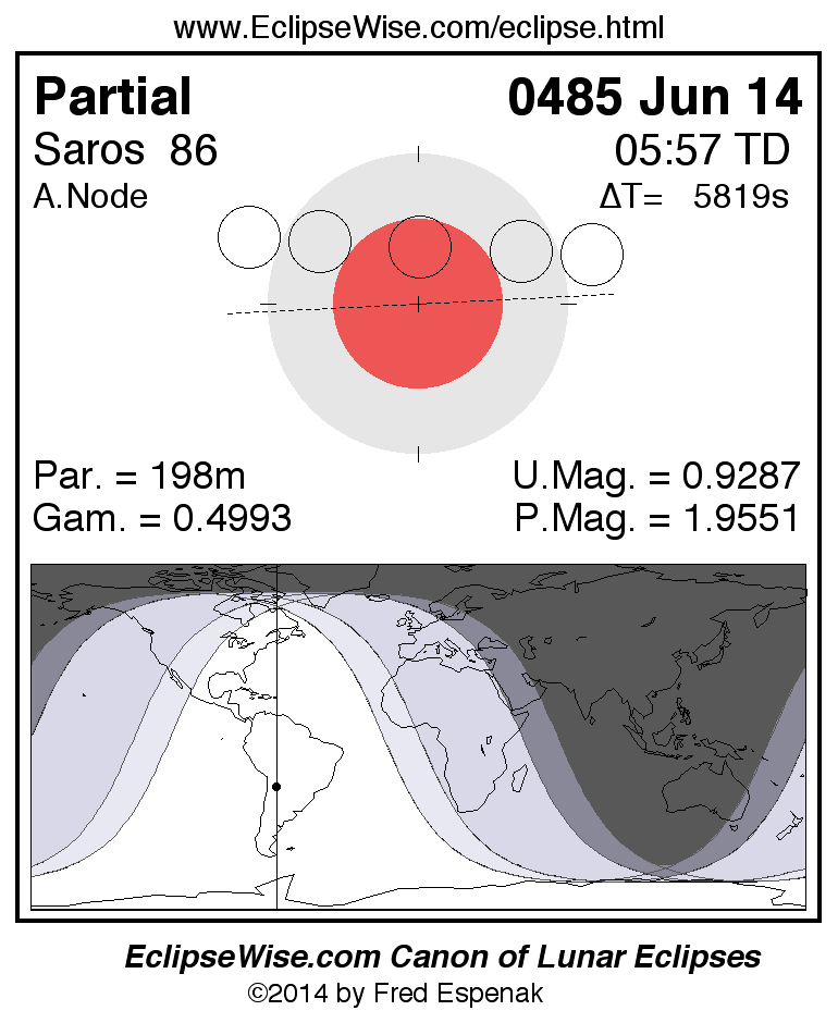 The partial lunar eclipse of 0485 Jun 14 is preceded two weeks earlier by a total solar eclipse on 0485 May 29.