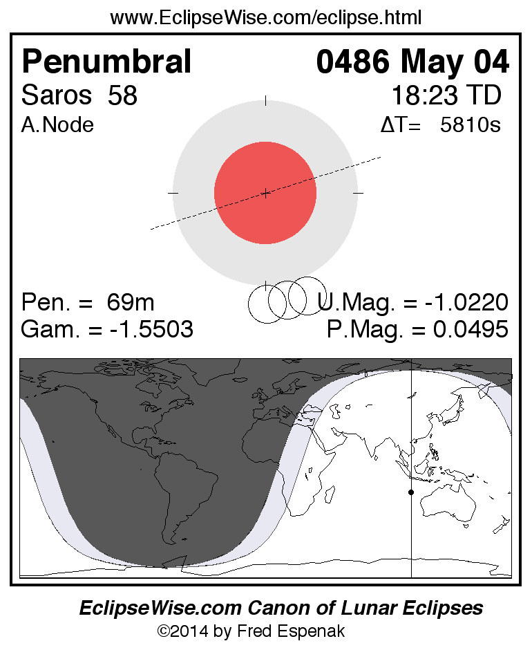 Another lunar eclipse occurs one synodic month after the 0486 May 04 eclipse. It is the penumbral lunar eclipse of 0486 Jun 03.