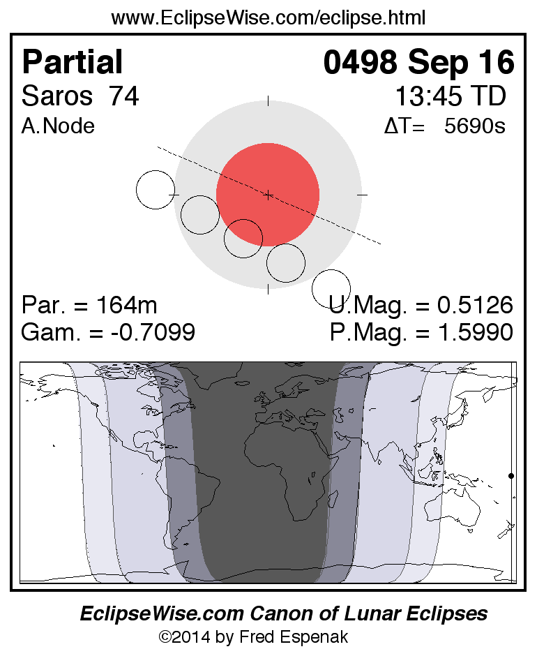 The instant of greatest eclipse takes place on 0498 Sep 16 at 13:44:53 TD (12:10:04 UT1).