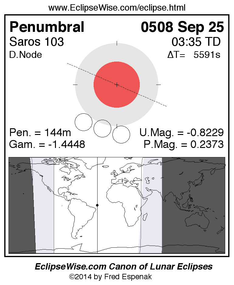 Another lunar eclipse occurs one synodic month before the 0508 Sep 25 eclipse. It is the penumbral lunar eclipse of 0508 Aug 26.