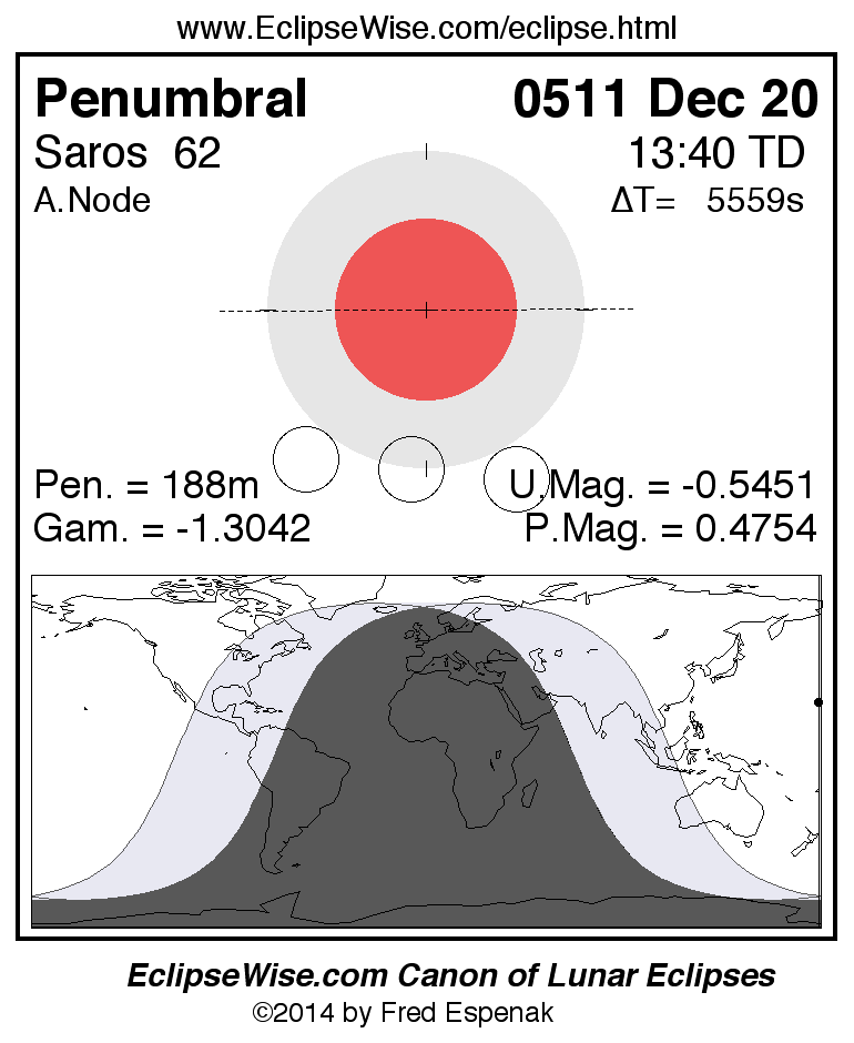 The instant of greatest eclipse takes place on 0511 Dec 20 at 13:40:18 TD (12:07:40 UT1).