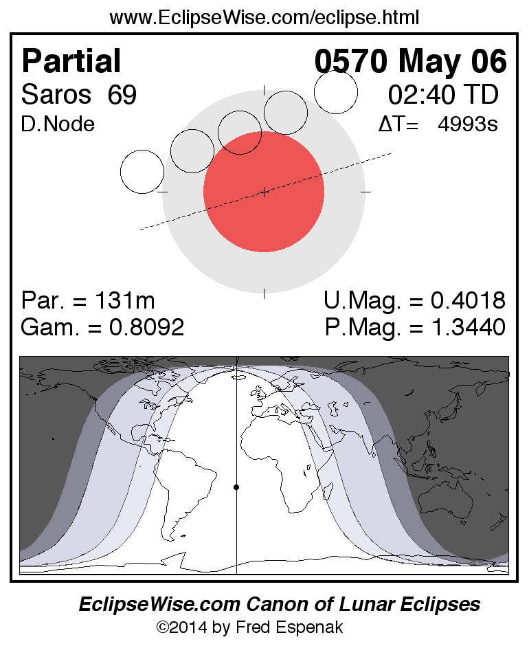The instant of greatest eclipse takes place on 0570 May 06 at 02:39:35 TD (01:16:23 UT1).
