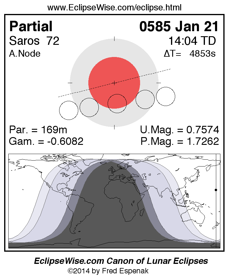 The instant of greatest eclipse takes place on 0585 Jan 21 at 14:03:38 TD (12:42:46 UT1).
