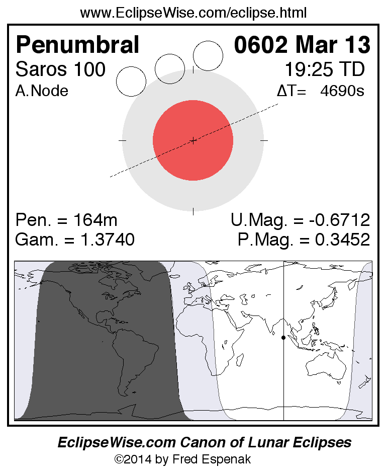 Another lunar eclipse occurs one synodic month before the 0602 Mar 13 eclipse. It is the penumbral lunar eclipse of 0602 Feb 12.