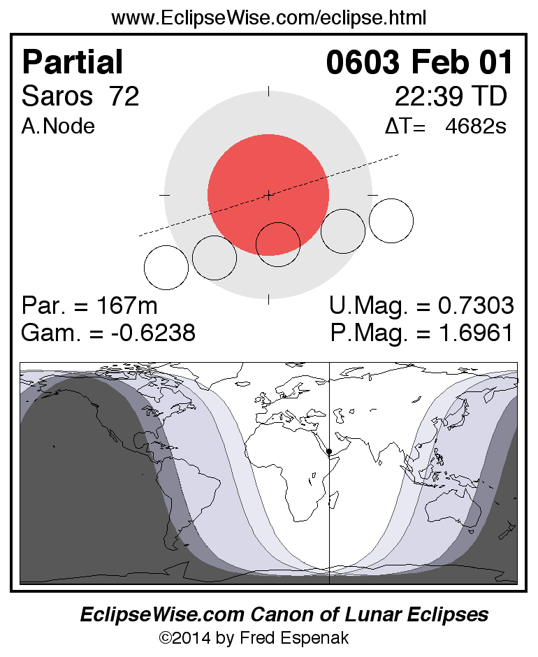 The partial lunar eclipse of 0603 Feb 01 is followed two weeks later by a annular solar eclipse on 0603 Feb 17.