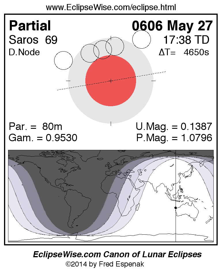 The partial lunar eclipse of 0606 May 27 is followed two weeks later by a annular solar eclipse on 0606 Jun 11.