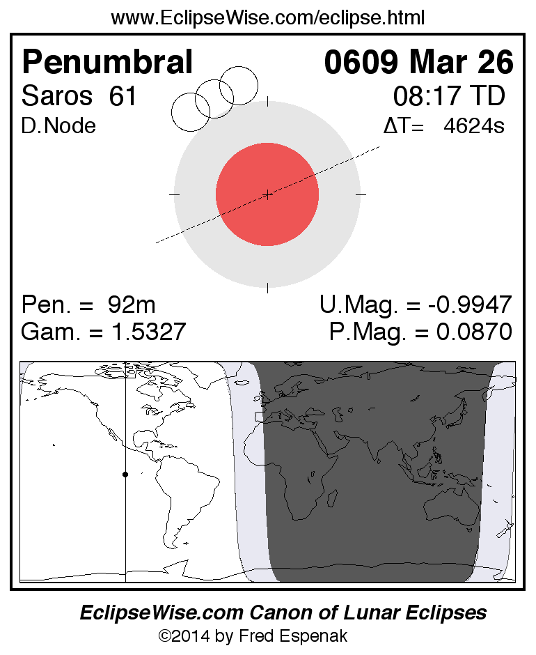 The penumbral lunar eclipse of 0609 Mar 26 is followed two weeks later by a total solar eclipse on 0609 Apr 10.