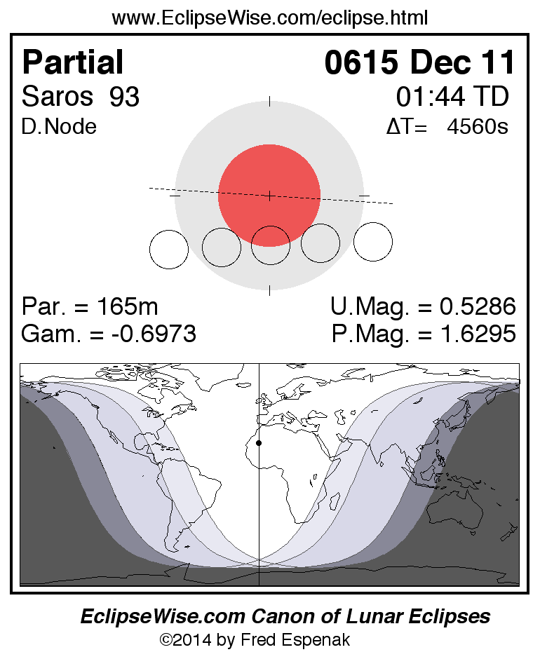The partial lunar eclipse of 0615 Dec 11 is preceded two weeks earlier by a total solar eclipse on 0615 Nov 26.