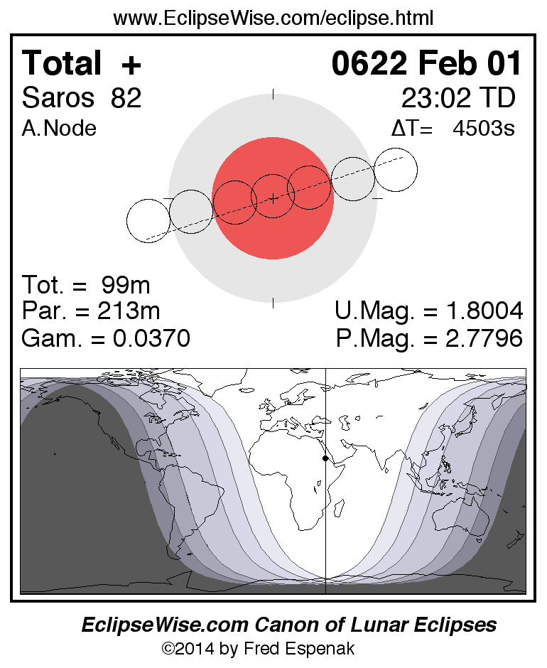 The total lunar eclipse of 0622 Feb 01 is preceded two weeks earlier by a partial solar eclipse on 0622 Jan 17,