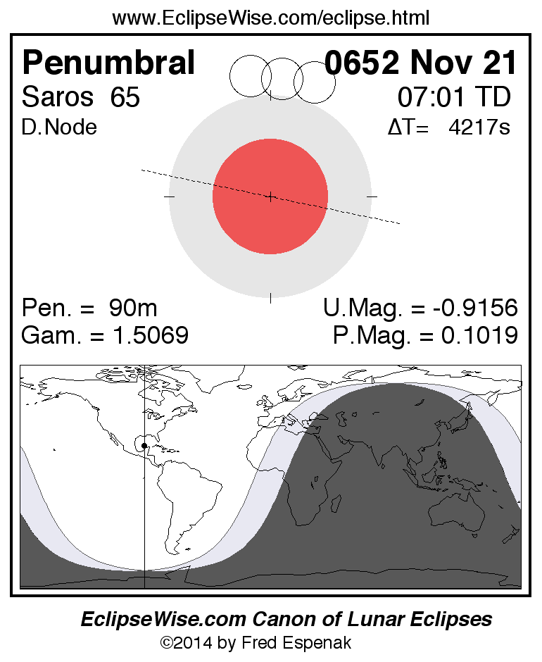Another lunar eclipse occurs one synodic month after the 0652 Nov 21 eclipse. It is the penumbral lunar eclipse of 0652 Dec 20.