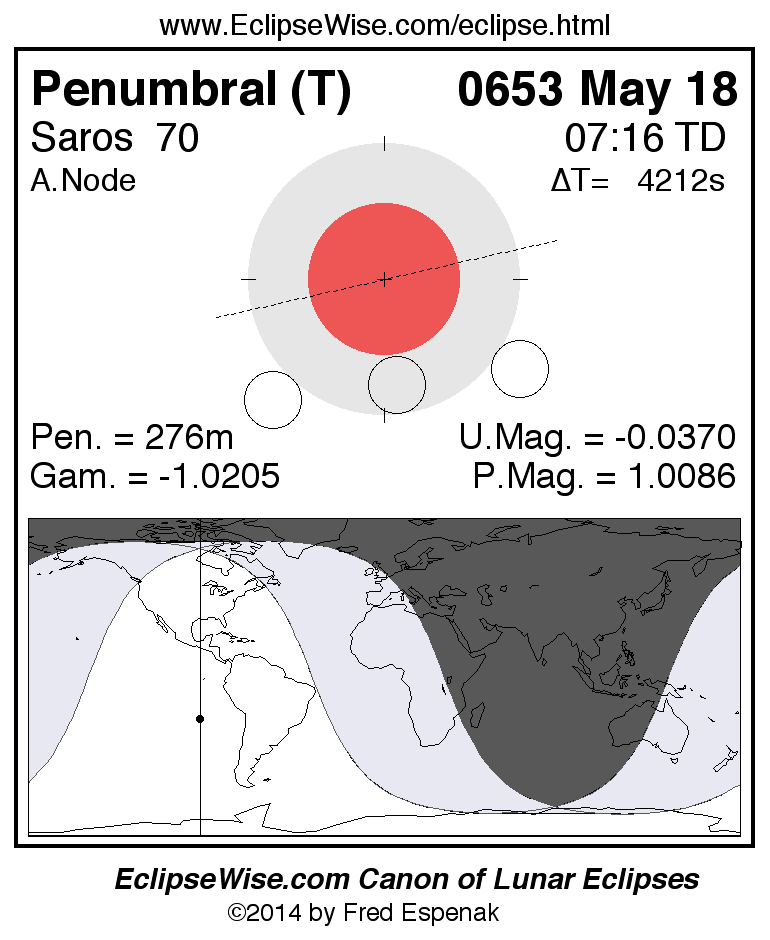 The penumbral lunar eclipse of 0653 May 18 is followed two weeks later by a total solar eclipse on 0653 Jun 01.