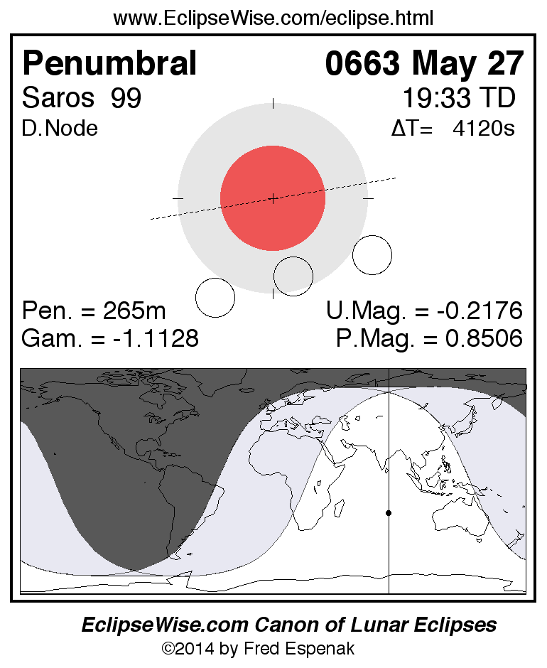 The penumbral lunar eclipse of 0663 May 27 is preceded two weeks earlier by a total solar eclipse on 0663 May 13.