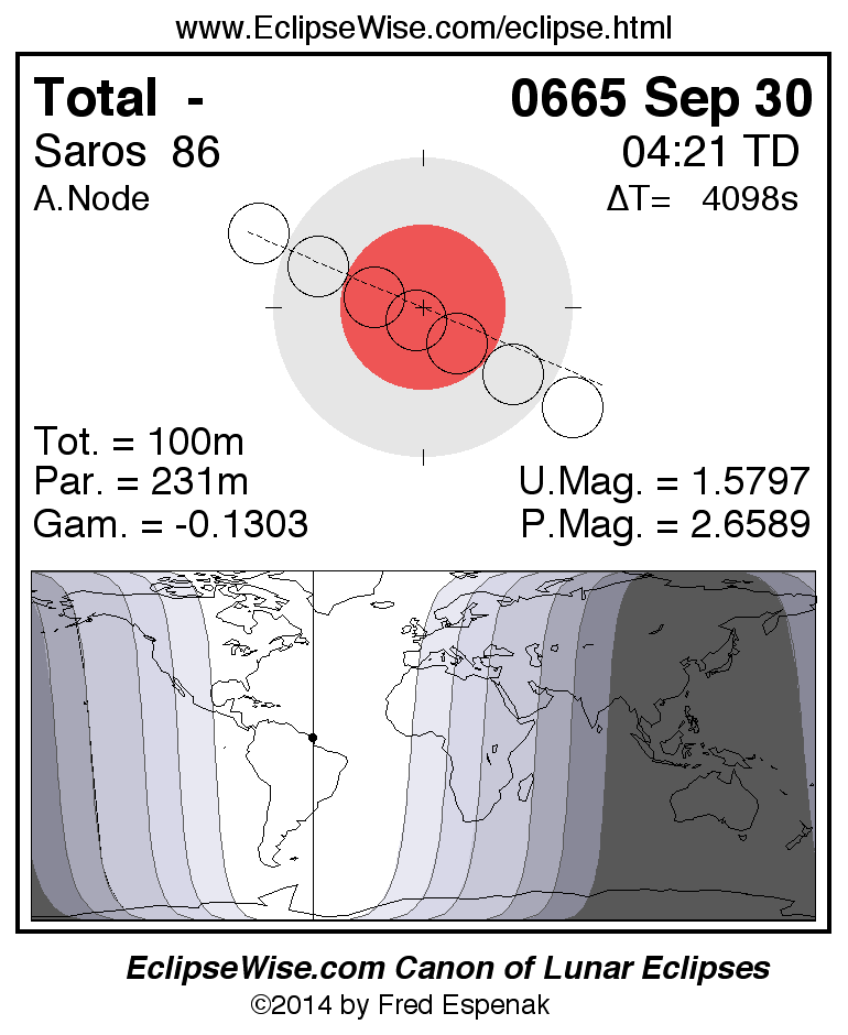 The total lunar eclipse of 0665 Sep 30 is preceded two weeks earlier by a partial solar eclipse on 0665 Sep 14,
