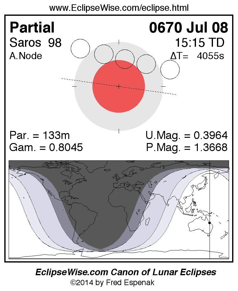 The instant of greatest eclipse takes place on 0670 Jul 08 at 15:14:49 TD (14:07:15 UT1).