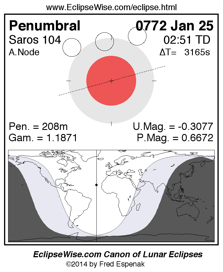 Another lunar eclipse occurs one synodic month before the 0772 Jan 25 eclipse. It is the penumbral lunar eclipse of 0771 Dec 26.