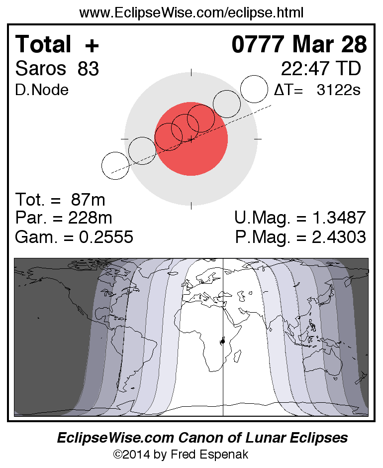 The total lunar eclipse of 0777 Mar 28 is preceded two weeks earlier by a partial solar eclipse on 0777 Mar 14,
