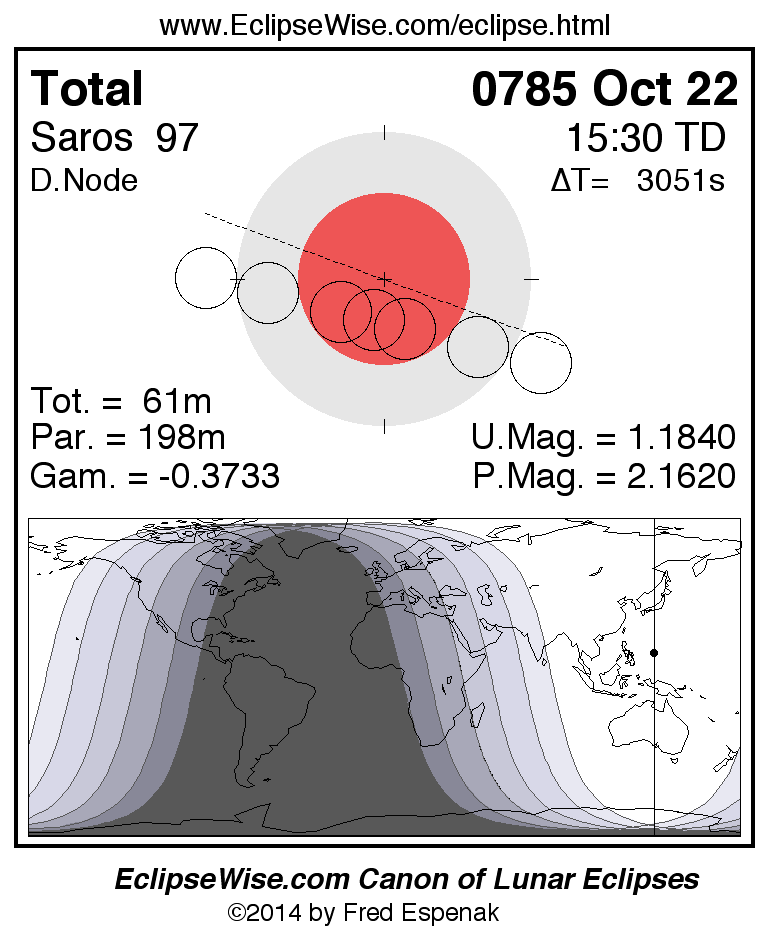The total lunar eclipse of 0785 Oct 22 is preceded two weeks earlier by a partial solar eclipse on 0785 Oct 08.