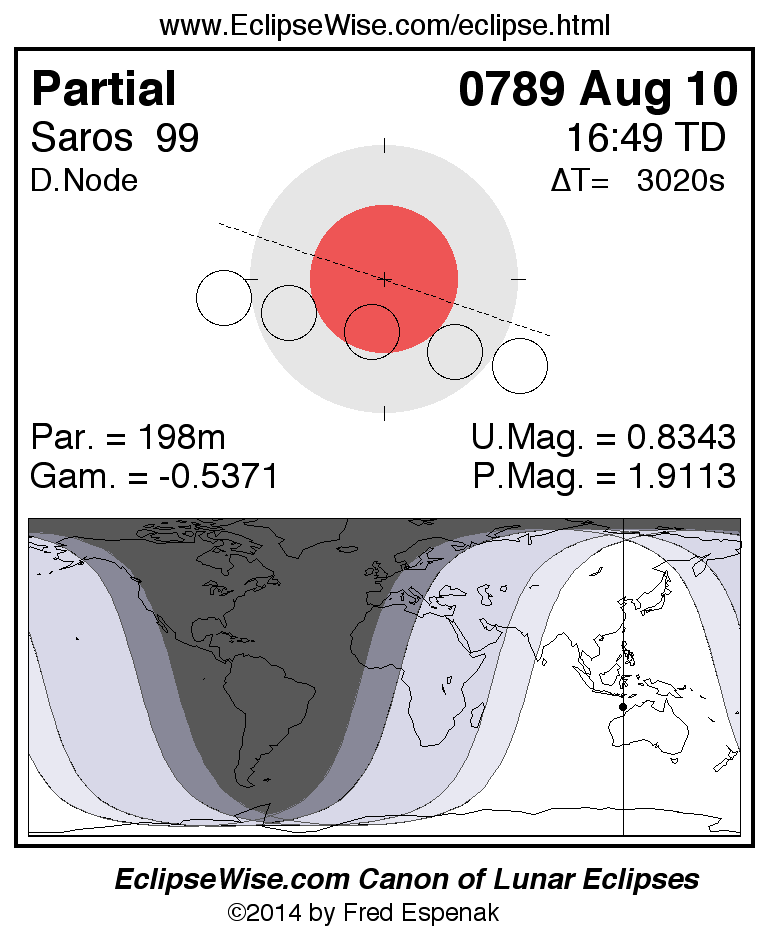 The instant of greatest eclipse takes place on 0789 Aug 10 at 16:49:29 TD (15:59:10 UT1).