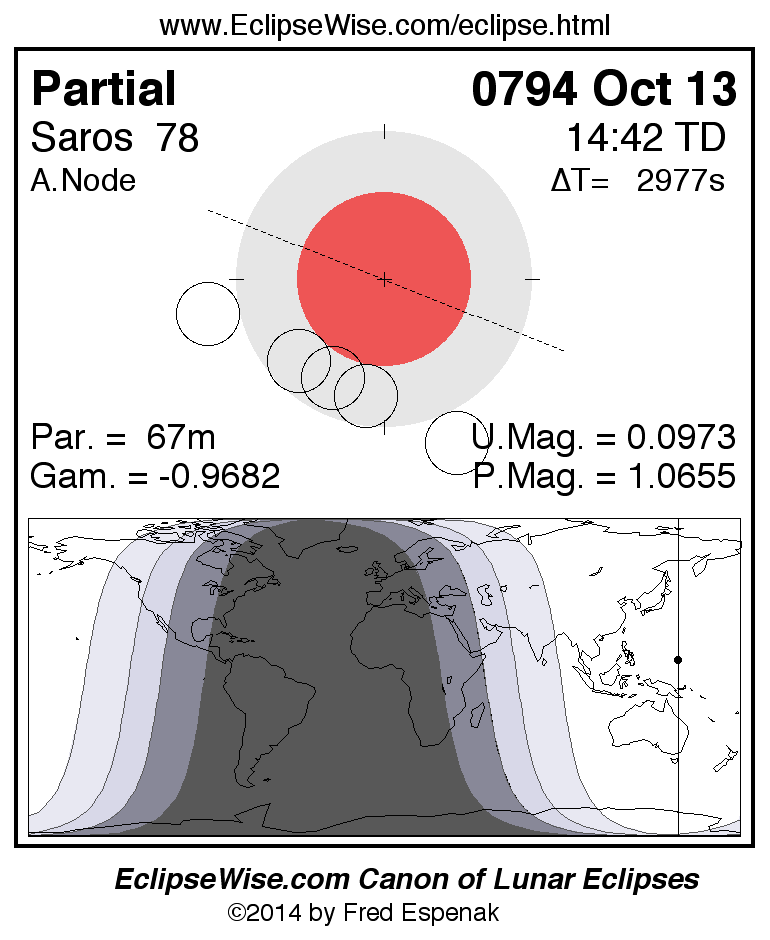 The instant of greatest eclipse takes place on 0794 Oct 13 at 14:42:19 TD (13:52:42 UT1).