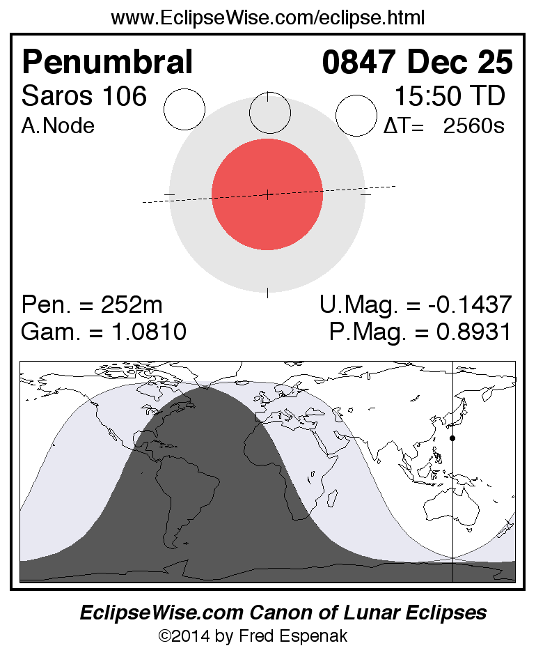 Penumbral Lunar Eclipse of 0847 Dec 25