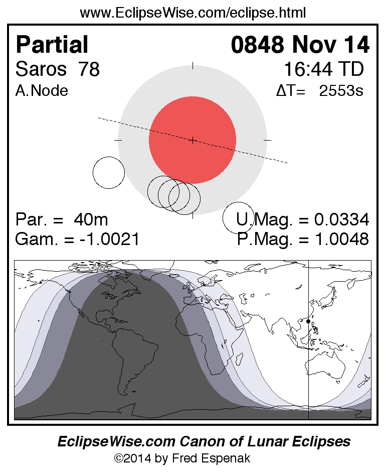 The partial lunar eclipse of 0848 Nov 14 is followed two weeks later by a annular solar eclipse on 0848 Nov 29.