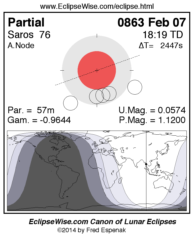 The instant of greatest eclipse takes place on 0863 Feb 07 at 18:19:11 TD (17:38:25 UT1).
