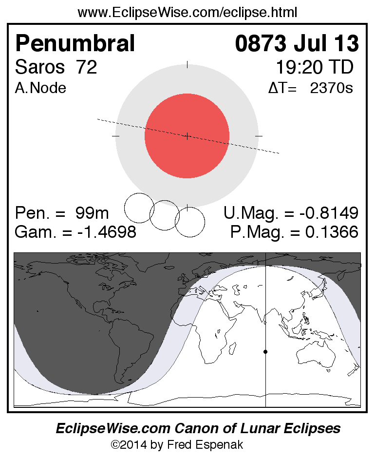 Another lunar eclipse occurs one synodic month after the 0873 Jul 13 eclipse. It is the penumbral lunar eclipse of 0873 Aug 12.