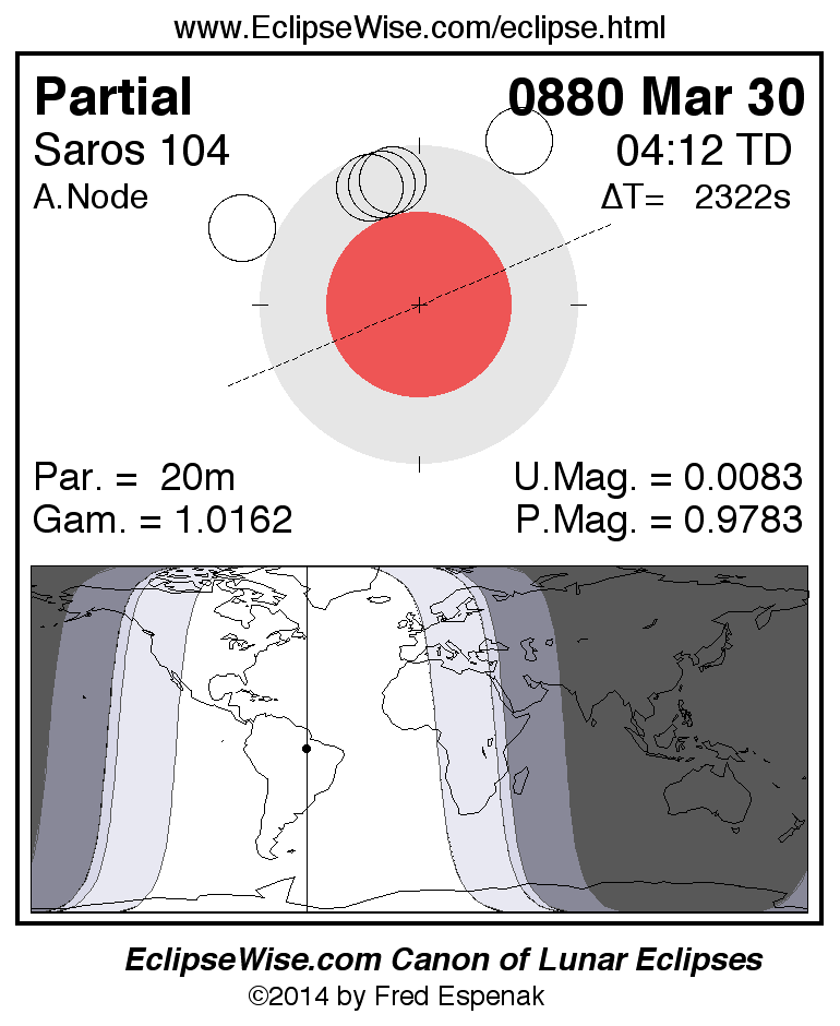 The instant of greatest eclipse takes place on 0880 Mar 30 at 04:11:39 TD (03:32:58 UT1).