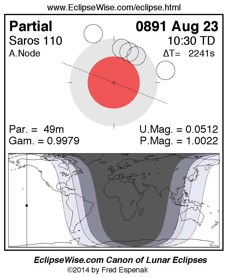Another lunar eclipse occurs one synodic month before the 0891 Aug 23 eclipse. It is the penumbral lunar eclipse of 0891 Jul 25.
