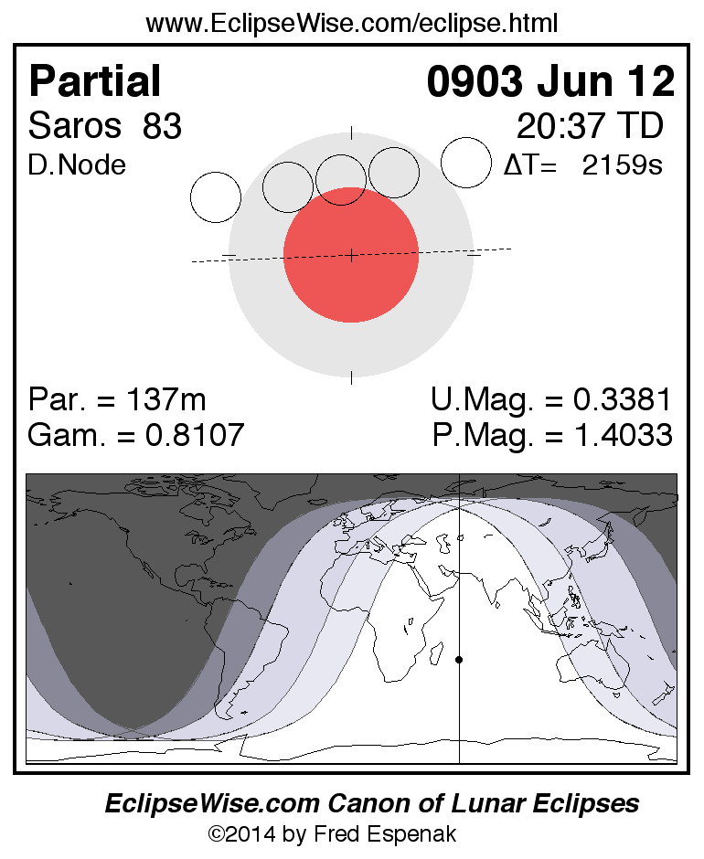 The instant of greatest eclipse takes place on 0903 Jun 12 at 20:36:52 TD (20:00:53 UT1).