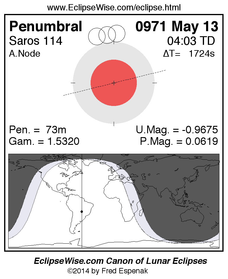The instant of greatest eclipse takes place on 0971 May 13 at 04:03:30 TD (03:34:46 UT1).