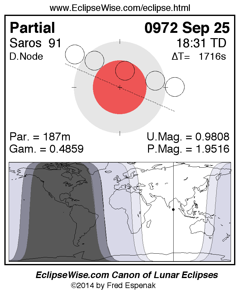 The instant of greatest eclipse takes place on 0972 Sep 25 at 18:30:48 TD (18:02:13 UT1).