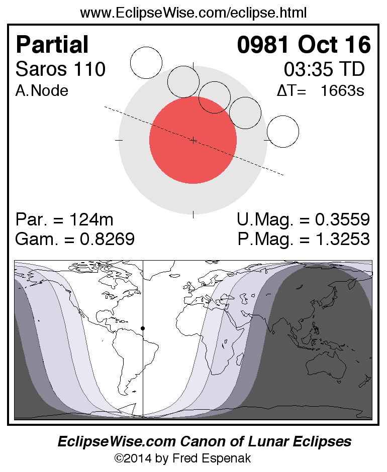 The instant of greatest eclipse takes place on 0981 Oct 16 at 03:34:37 TD (03:06:54 UT1).