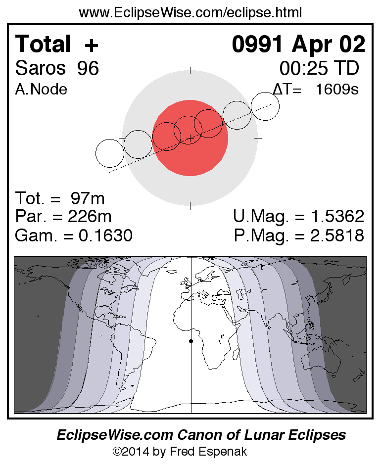 The total lunar eclipse of 0991 Apr 02 is preceded two weeks earlier by a partial solar eclipse on 0991 Mar 19,