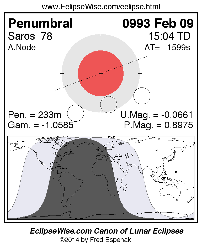 The penumbral lunar eclipse of 0993 Feb 09 is followed two weeks later by a annular solar eclipse on 0993 Feb 24.