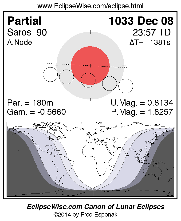 The instant of greatest eclipse takes place on 1033 Dec 08 at 23:57:04 TD (23:34:04 UT1).