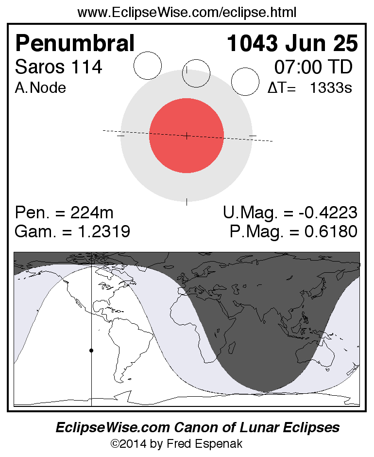 Another lunar eclipse occurs one synodic month before the 1043 Jun 25 eclipse. It is the penumbral lunar eclipse of 1043 May 26.