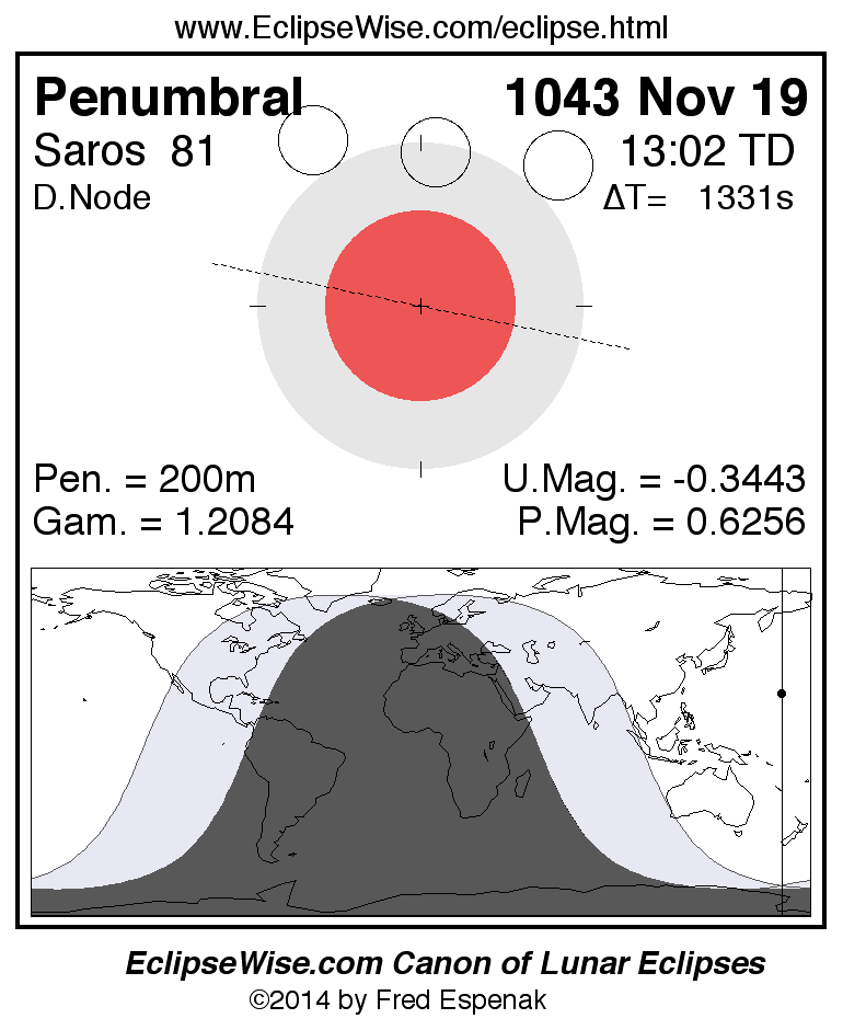 Another lunar eclipse occurs one synodic month after the 1043 Nov 19 eclipse. It is the penumbral lunar eclipse of 1043 Dec 18.