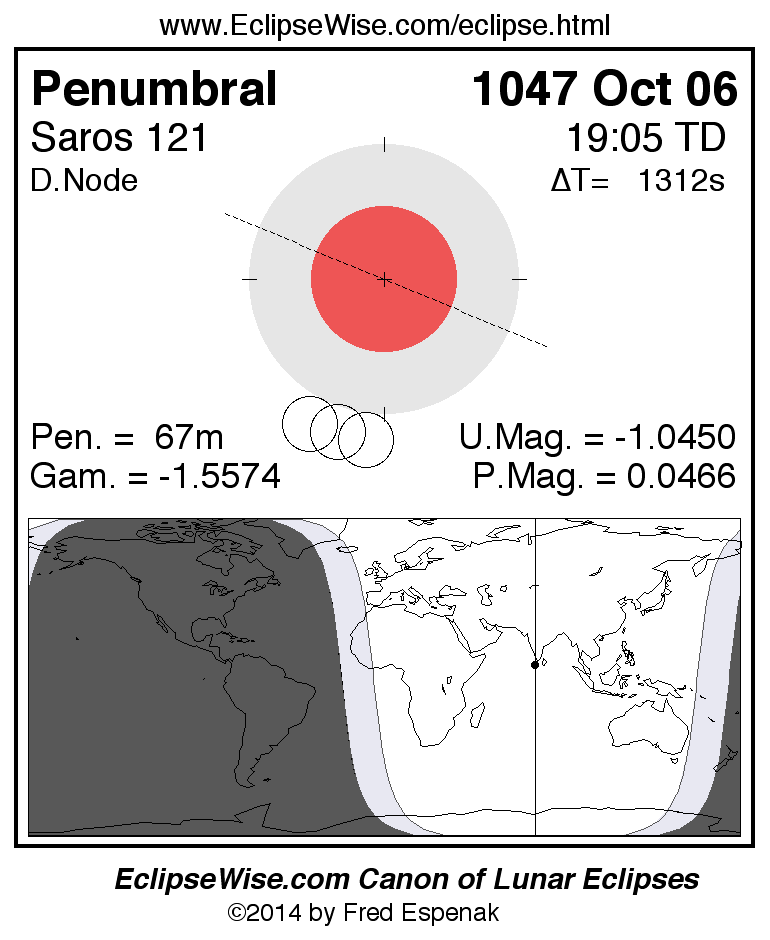 Another lunar eclipse occurs one synodic month before the 1047 Oct 06 eclipse. It is the penumbral lunar eclipse of 1047 Sep 07.