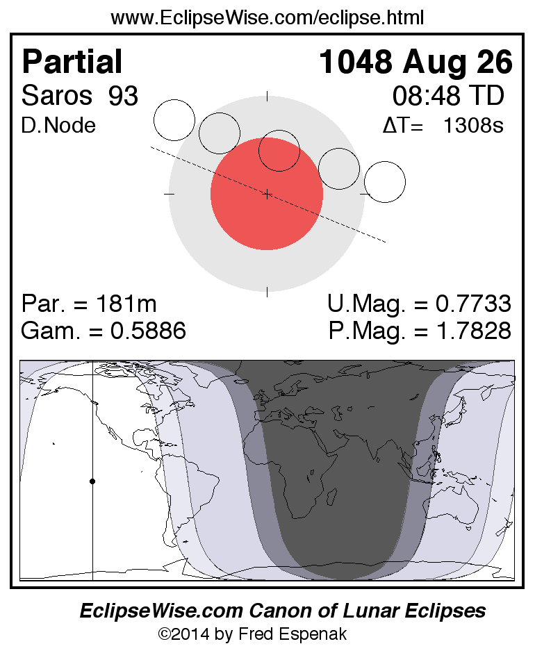 The instant of greatest eclipse takes place on 1048 Aug 26 at 08:47:35 TD (08:25:48 UT1).