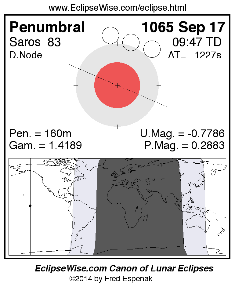 Another lunar eclipse occurs one synodic month after the 1065 Sep 17 eclipse. It is the penumbral lunar eclipse of 1065 Oct 17.