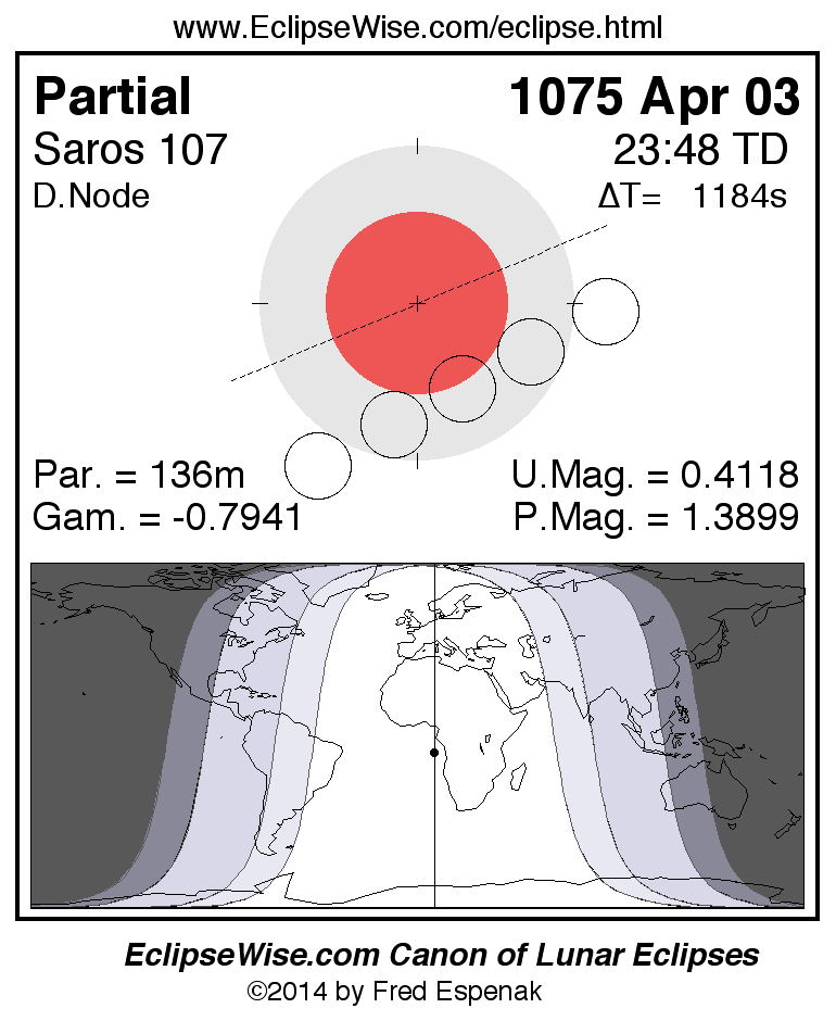 The instant of greatest eclipse takes place on 1075 Apr 03 at 23:48:04 TD (23:28:20 UT1).