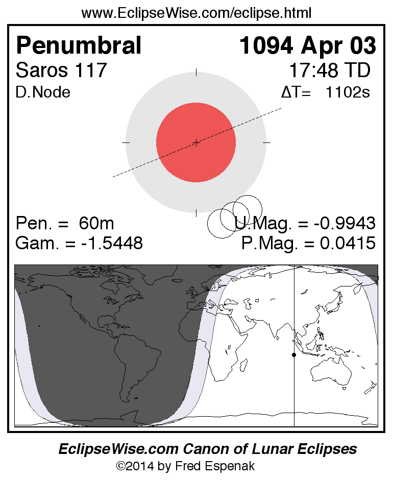 The penumbral lunar eclipse of 1094 Apr 03 is preceded two weeks earlier by a total solar eclipse on 1094 Mar 19.